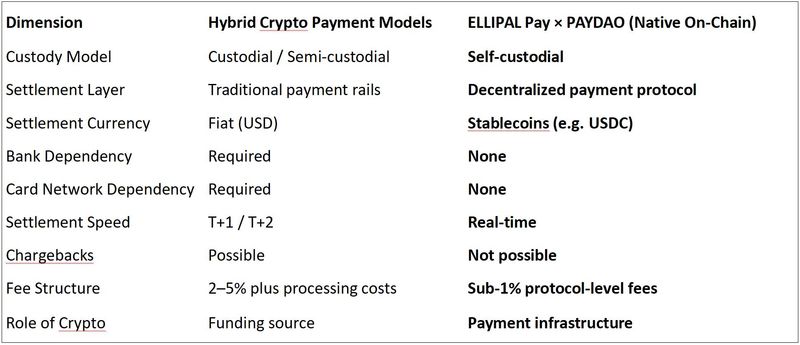 The difference between hybrid crypto payment models and native on-chain payments becomes clear at the architectural level: